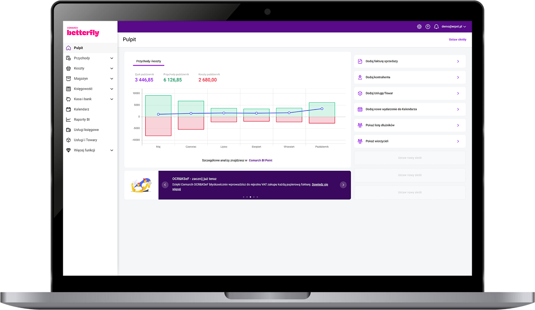 Comarch Betterfly to inteligentny system do księgowości online, który sprawia, że rozliczasz się samodzielnie. Prowadzi Cię krok po kroku – od wystawienia eFaktury aż po gotowy plik JPK. Wszystko jest w pełni zgodne z KSeF, najnowszymi przepisami i wymogami Ministerstwa Finansów.