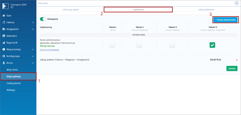 Aby dodać nowego użytkownika należy przejść do zakładki Konto >> Pakiety >> Użytkownicy i nacisnąć przycisk “+ dodaj użytkownika“. Następnie należy wybrać i wykupić pakiet dla dodatkowych użytkowników.
